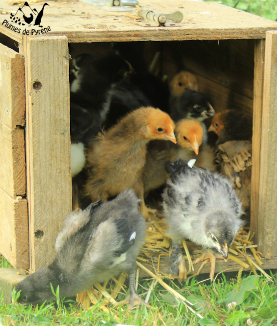 Cette couvée, née le 15 juin, est issue d’oeufs venant d’autres éleveurs, et devrait nous préparer notre relève de poules de races (en attendant qu’on puisse séparer nos volailles en parquets de race. 😉 ) :